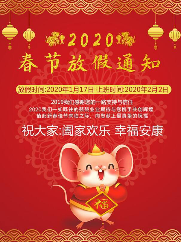 春節放假時間:2020年1月17日至2020年2月2日,2月3日正常上班。