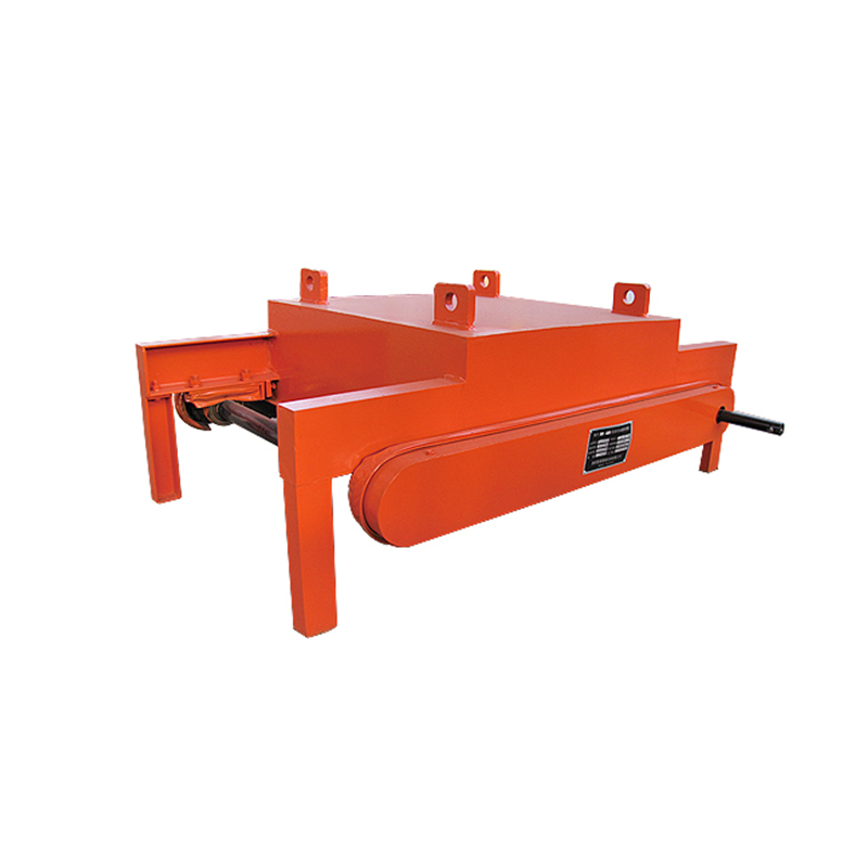 當磁鐵底部吸附的鐵磁性雜物累積到一定程度時,人工搖動手柄驅動刮板,清理廢鐵。