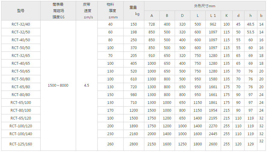 RCT型全磁滾筒與RCTG係列等同,亦稱磁滑輪或幹式大塊磁選機。其內部采用高性能強磁材料組成強力磁係,具有磁場強度高、大、結構簡單、使用方便、不需要維修、不消耗電力,常年使用退磁率小等特點。可用於水泥、磁選、礦山、鋼鐵、化工、耐火材料、垃圾處理等行業的選鐵。