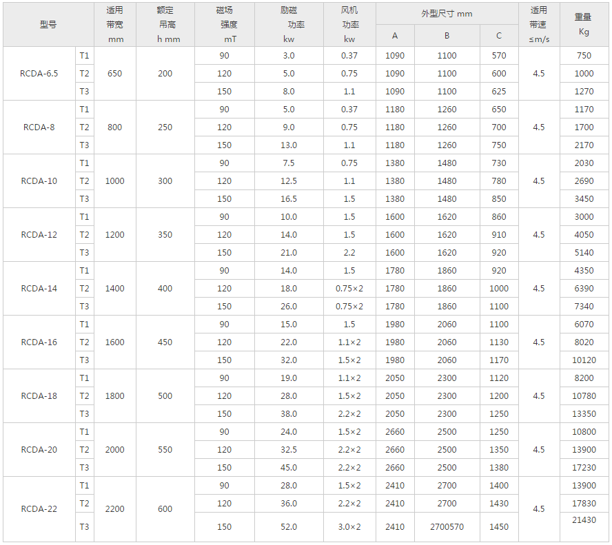 RCDA-T型超強風冷電磁成人午夜视频网站內部磁路設計獨特,透磁深,吸力大,吸力遠大於國標除鐵器。軸流式風機強迫風冷,風量大,使除鐵器散熱快、溫升低,保障除鐵器無故障長期工作。