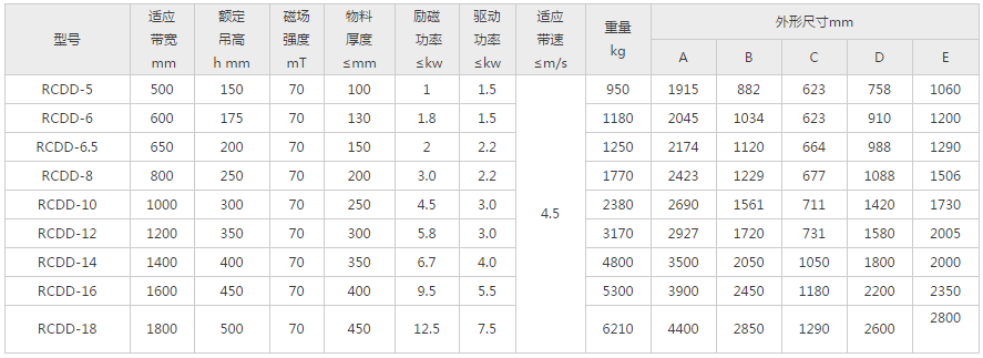 RCDD型電磁自卸式成人午夜视频网站是一種用於自動粉狀或塊狀非磁性物料中雜鐵的除鐵裝置。其內部采用電工專用樹脂澆注,自冷式全密封結構。具有透磁大、吸力強、防塵、防雨、耐腐蝕、皮帶可自動糾偏等優點,在惡劣的環境中仍能可靠運行。